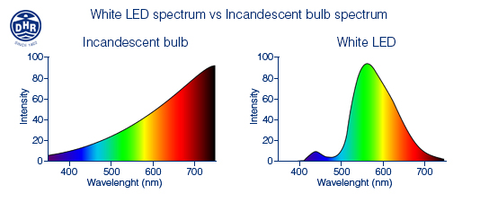 1. An approved incandescent bulb has a wide visible spectrum that can be detected by the human eye. LED bulbs, on the other hand, have more narrow spectrum.