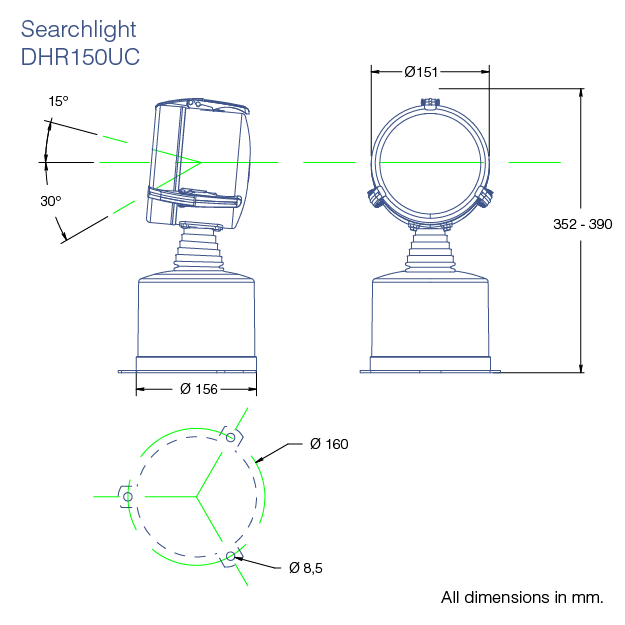The DHR150 Searchlight is the most compact searchlight manufactured by DHR. Made of brushed 316L stainless steel with a 10V - 32V LED insert and a clear white beam. The ball joint cabin control is used for operation from the wheelhouse. Because of its relatively small size it is very suitable for vessel low in height.
